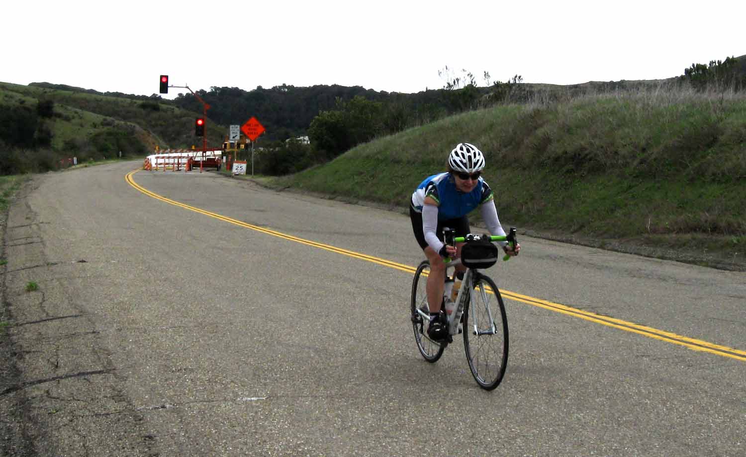 Florence on her new Madrone, barrelling down grade at the Jalama Road wash out